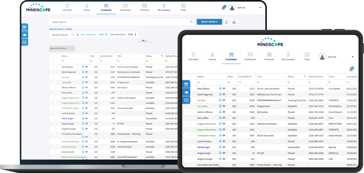 Mindscope gives recruiters robust front and back-office functionality that empowers them to make more placements, faster. Mindscope's solutions enable you to stay ahead of staffing and recruiting requirements with powerful tools and intuitive features. With our staffing software at their fingertips, recruiters have all the tools they need to improve workflows and streamline recruitment processes.